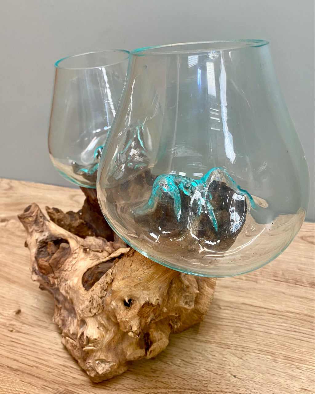 - This is a unique sculpture designed to hold a two glass vase's in place, carved from driftwood. Each piece comes with two molten glass vase's that fits uniquely into the shape of the wood.