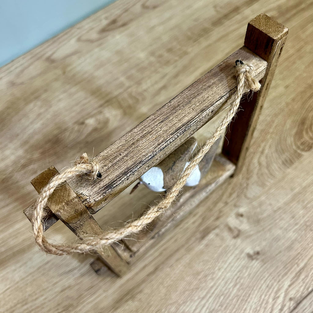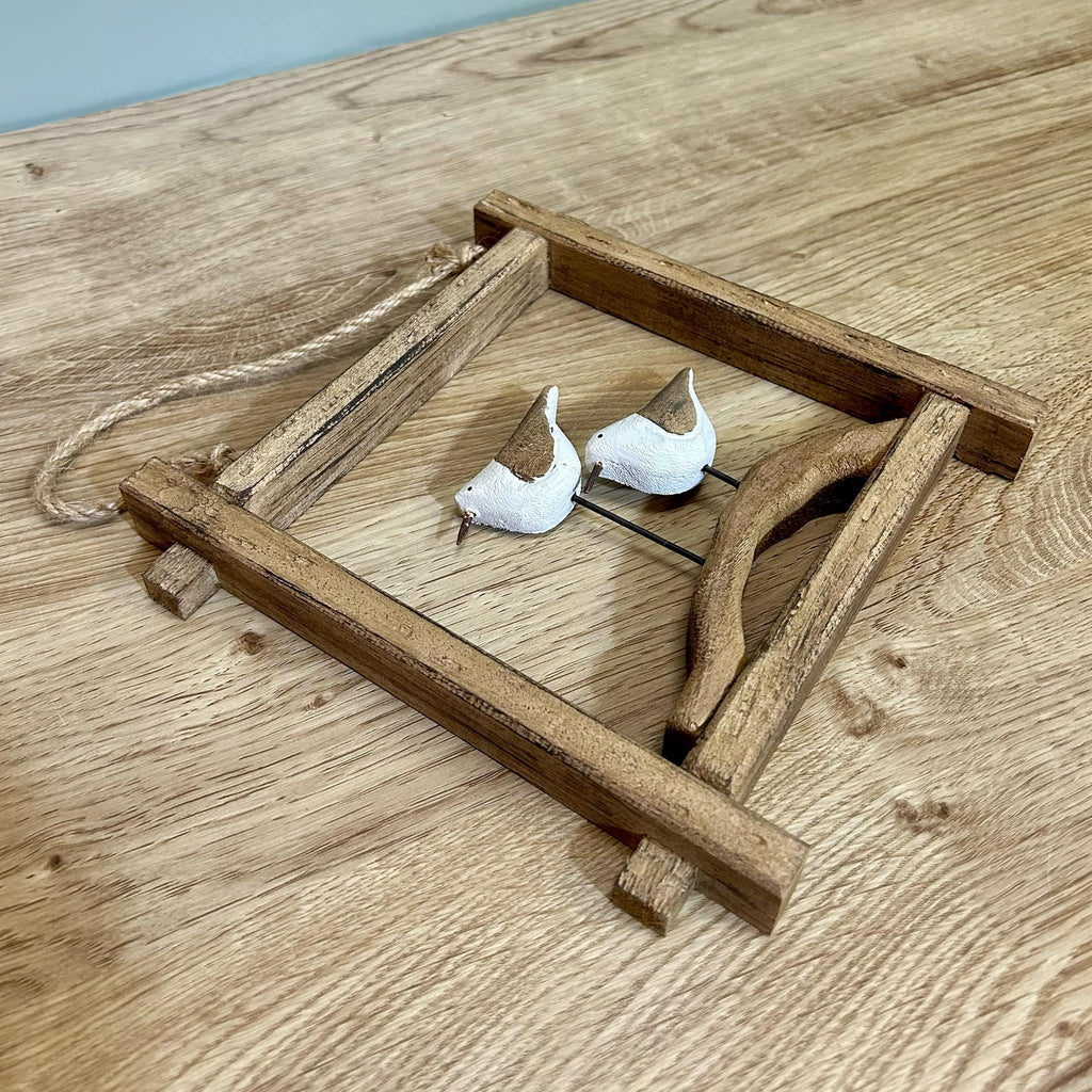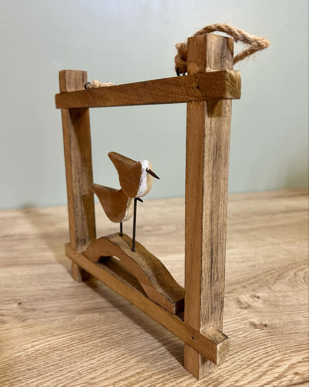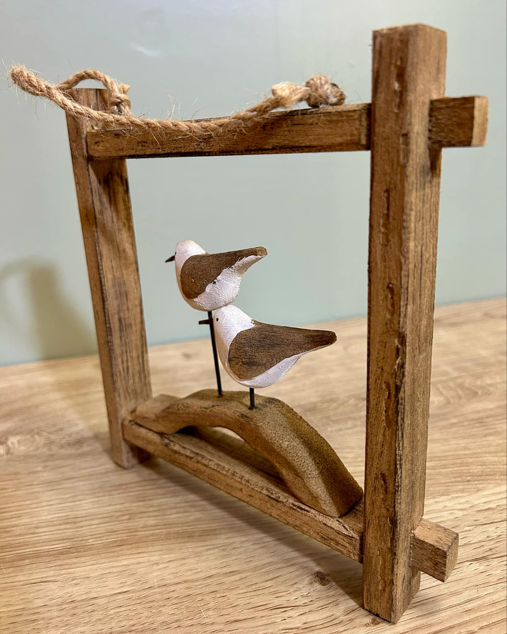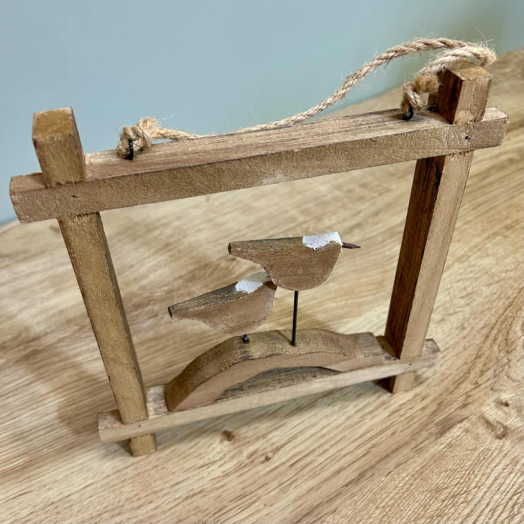 - This is a delightful rustic hanging frame in the style of a seagulls on a branch, made from wood with a rope handle which can be used to hang up the ornament