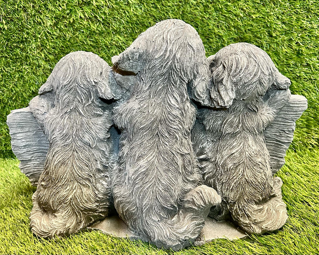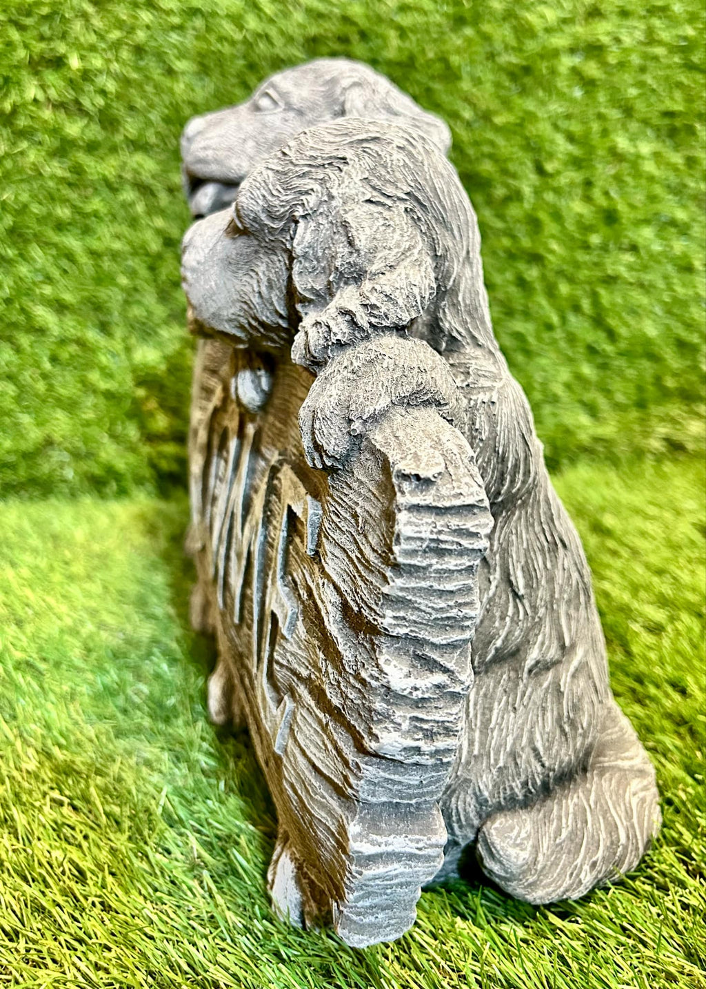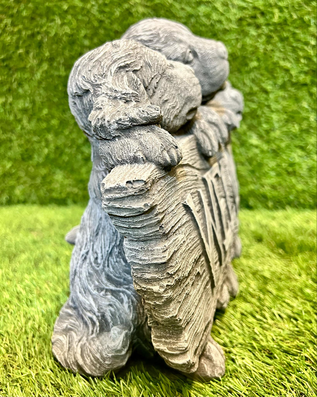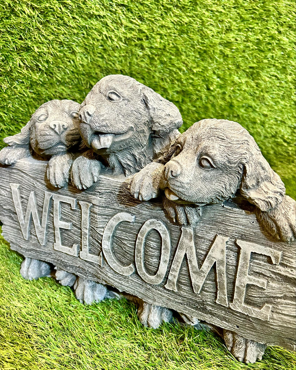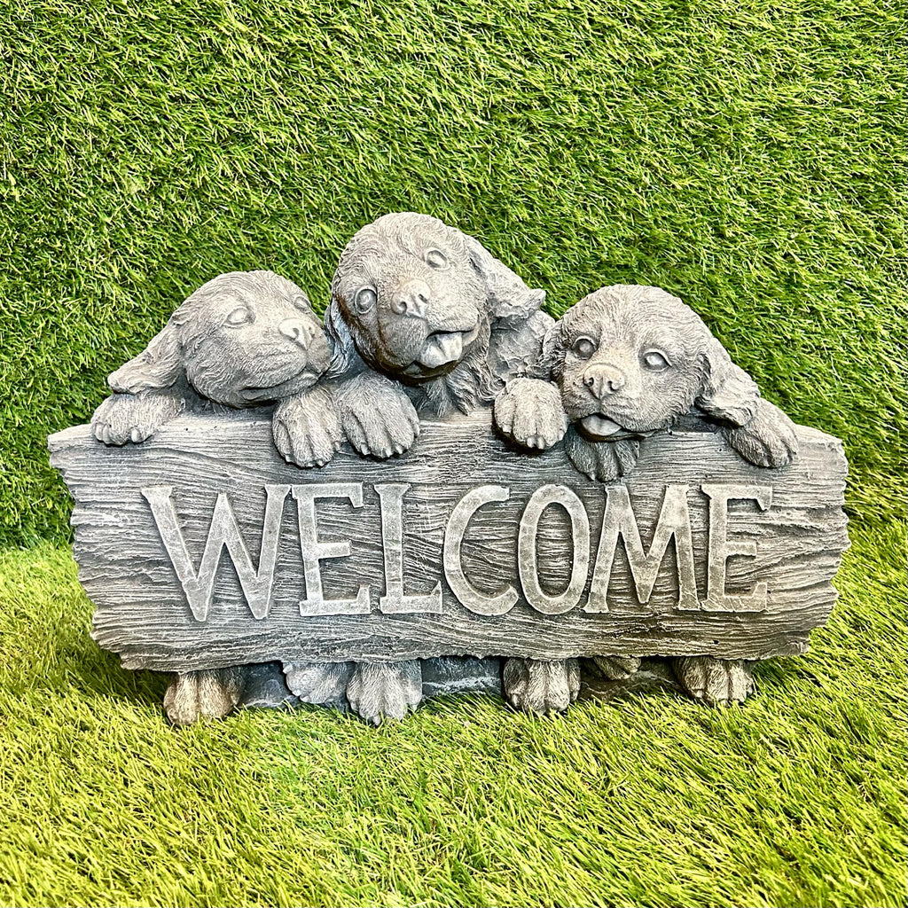 - This is a large ornament in the style of puppies behind a sign that reads 'welcome'. It is beautifully hand crafted made from high quality frost free concrete & weather resistant paint suitable for all seasons outdoors.