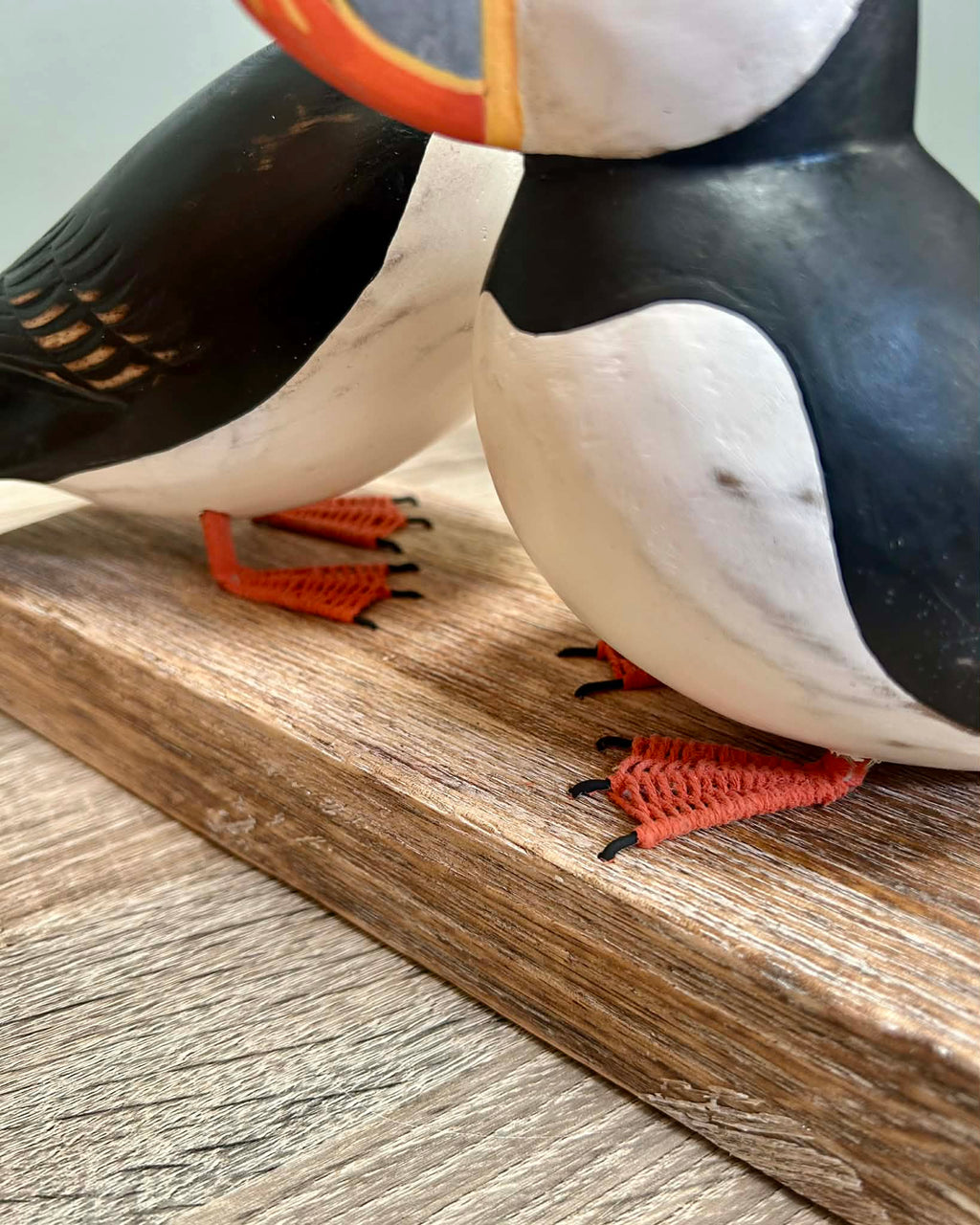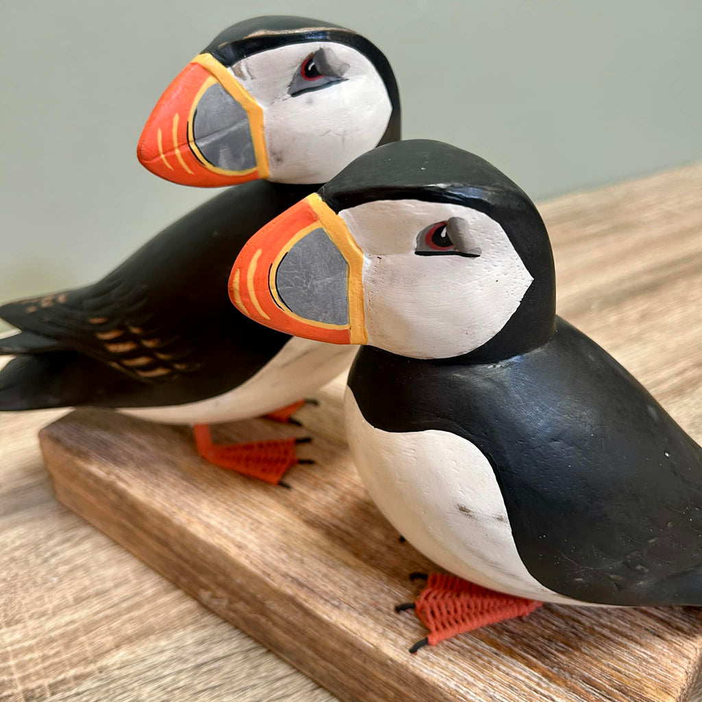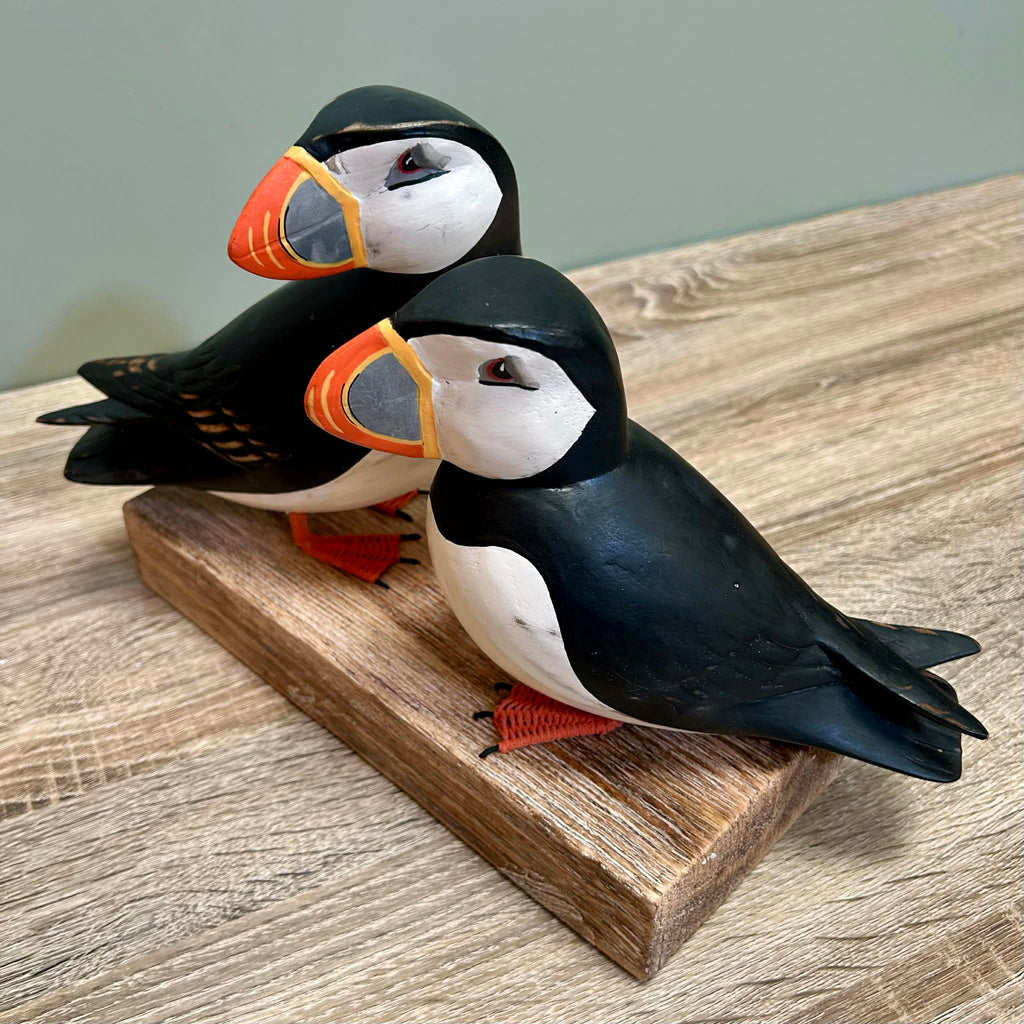 - This is a fantastic ornament in the style of two puffins perched on a stand. The ornament is made from wood. The puffins have been beautifully painted in exquisite detail.