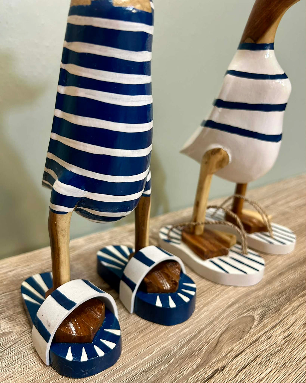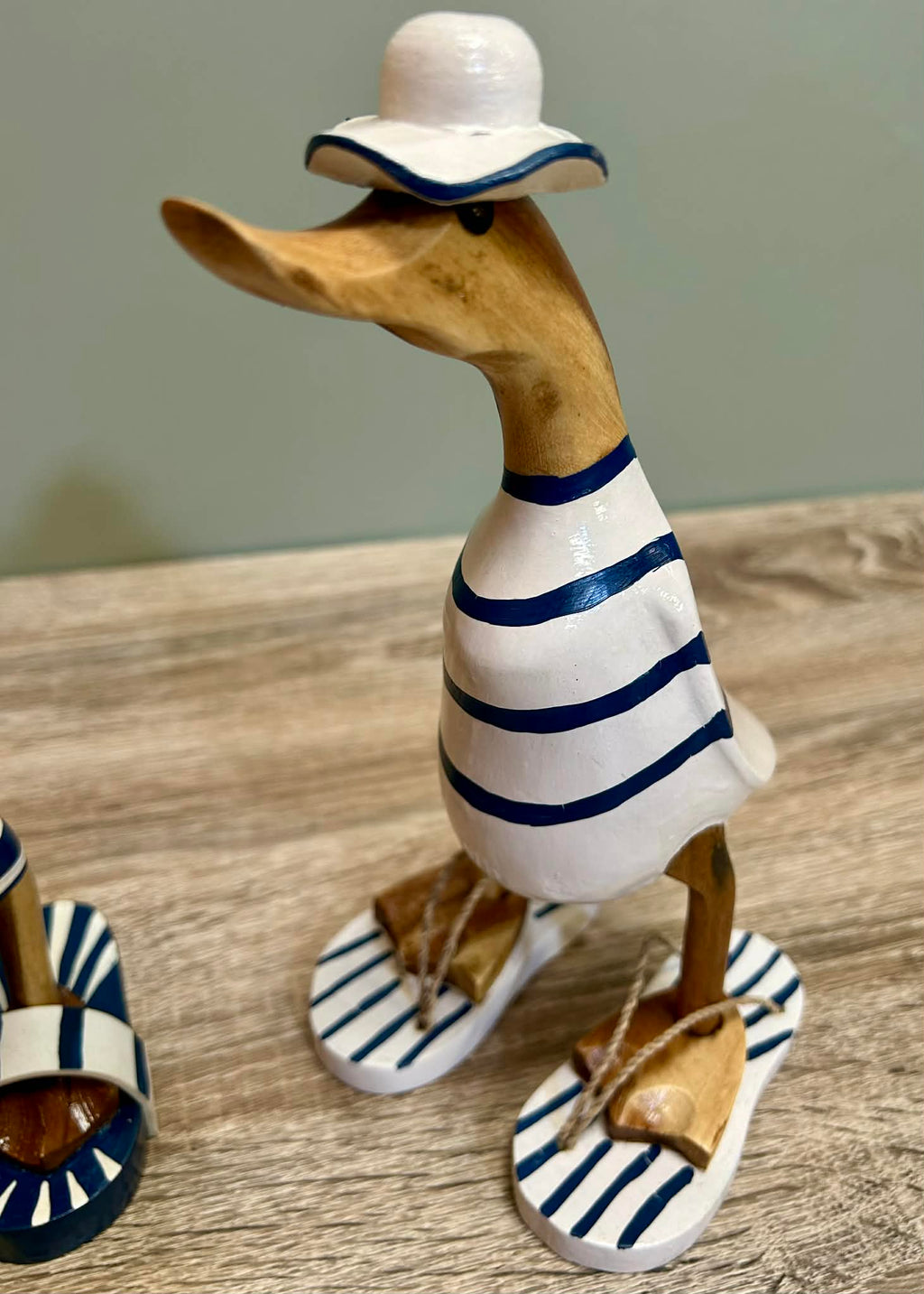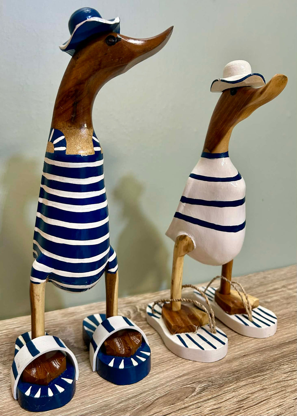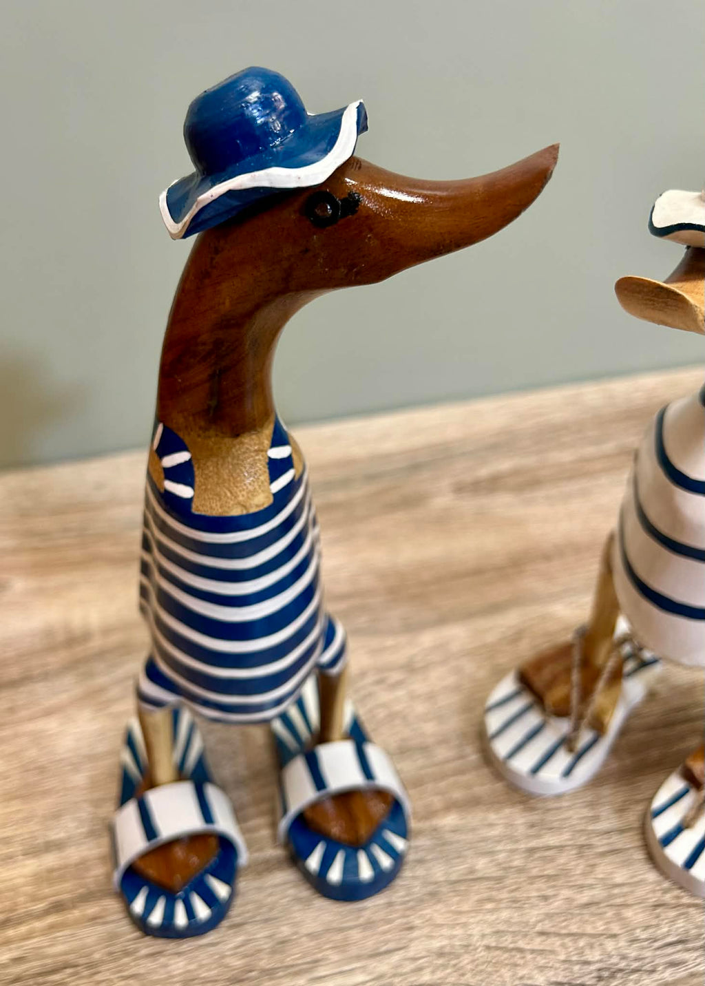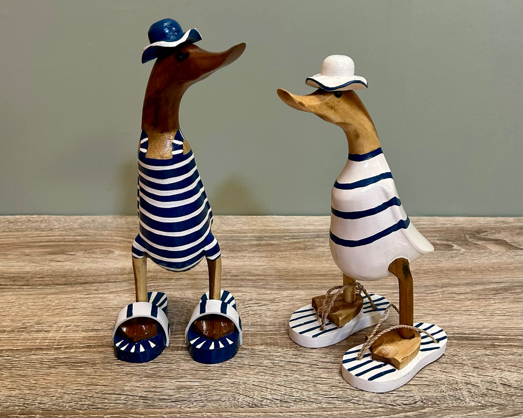 - These are delightful ornaments in the style of ducks in swimsuits. made from carved wood and come in two different styles.